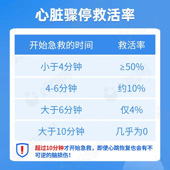 心源性猝死发病的第一个直接反应就是心脏骤停,从发生心脏骤停开始,只有宝贵的4分钟时间施救,超过4分钟后的施救即便救治回来也会由于大脑长时间缺氧而产生不可逆损伤。
