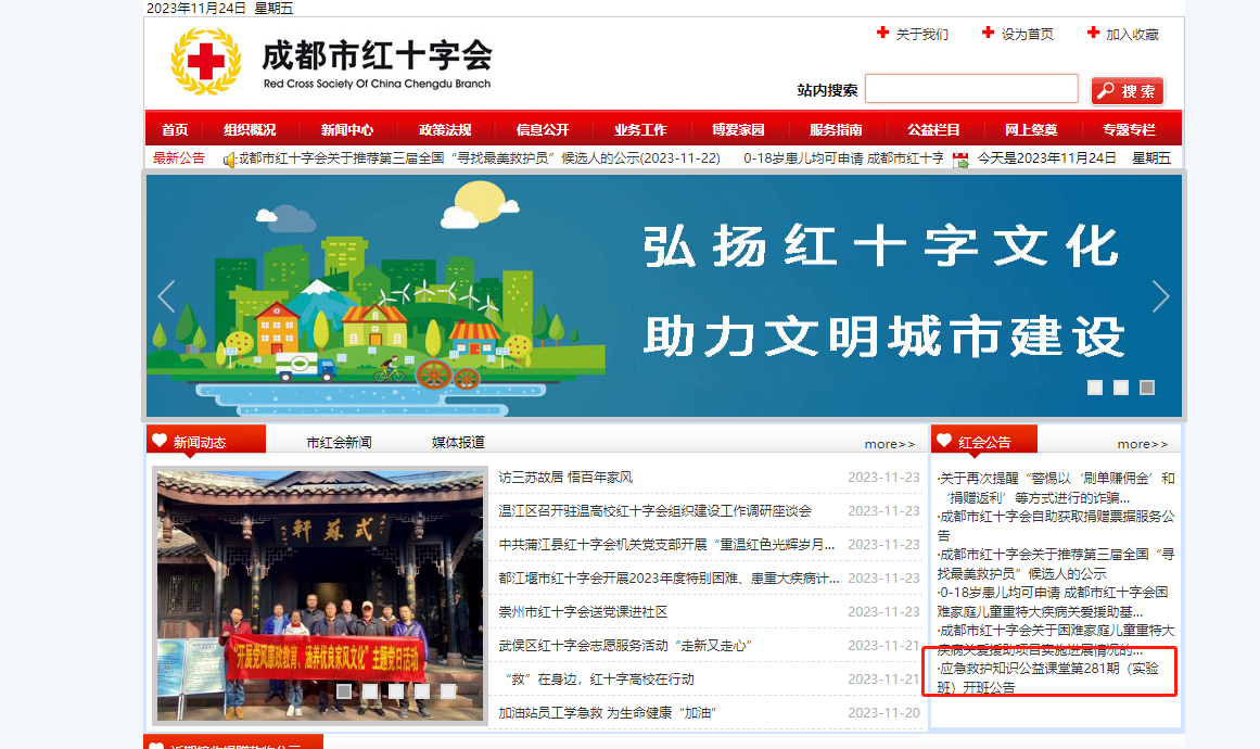 打开成都市红十字会官网,在公告区找到最近的 -> 应急救护知识公益课堂第xxx期(实验班)开班公告)